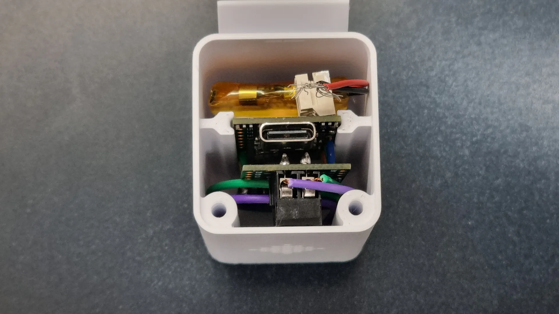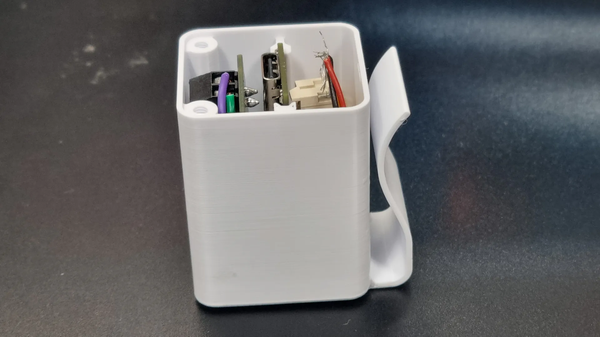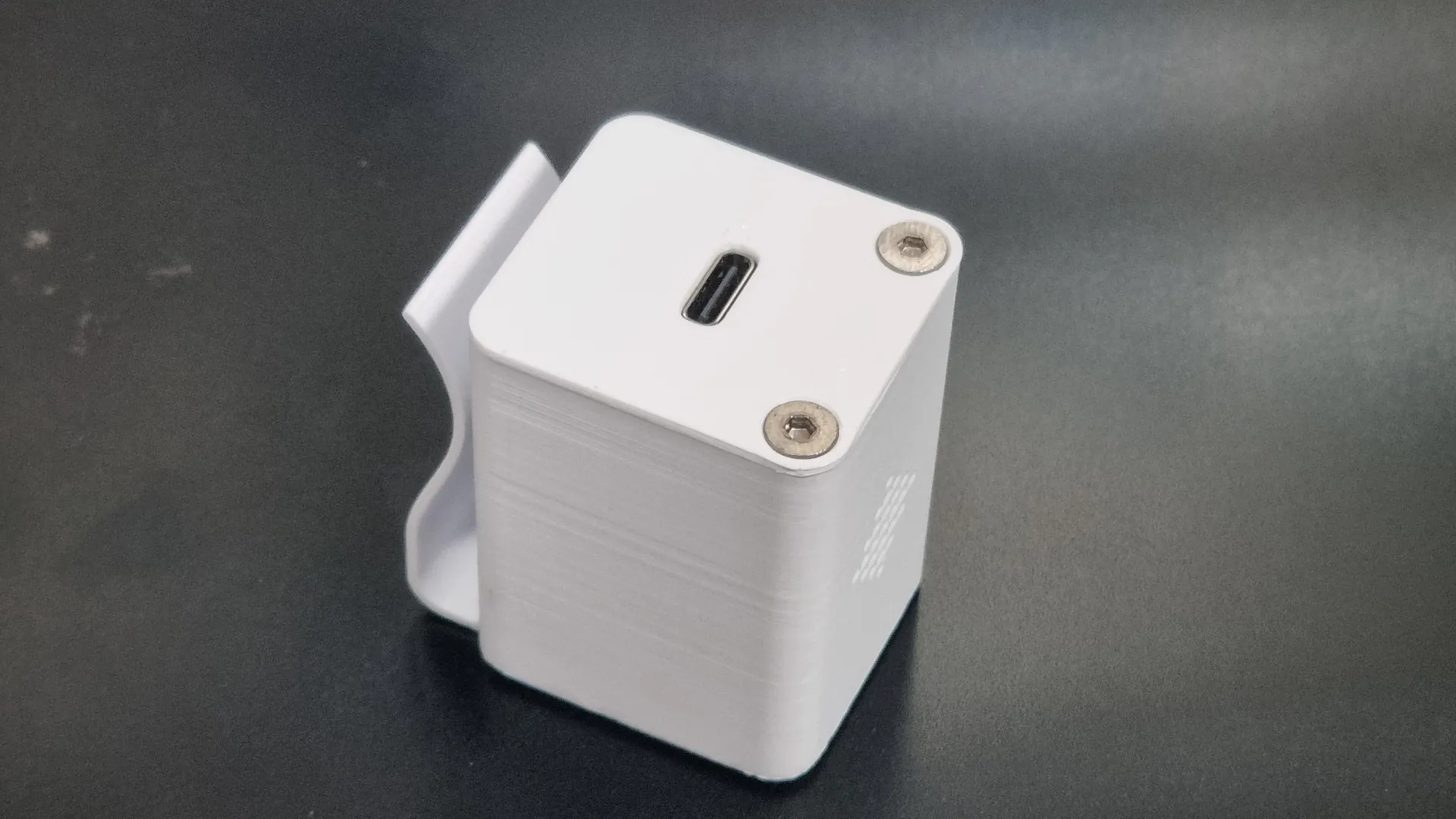 어떤 제품인지는 잘 모르겠지만 클립형으로 벨트, 가방 끈 등에 장착이 가능한 소형 IOT 기기를 위한 케이스를 제작하였습니다. 기판의 크기, 충전단자 위치 등을 고려하여 설계를 진행하고 FDM 방식 3D프린팅으로 제작하였습니다